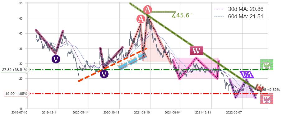 🦴 长线均值回复组合短线趋势跟踪[强阻力信号]2020-12-01-2022-08-12下跌趋势依然成立(下跌趋势跟踪依然存在),短线价格略微上行反弹(均值回复猜想),即将接近下跌趋势提供的未破位阻力价格:21.28。