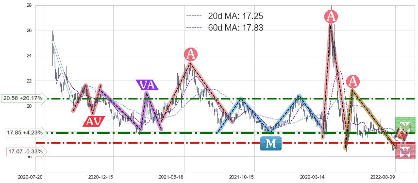 ♘ 阻力价格位17.85,可信任强度76.71%,距离最后交易2022-08-12形成的收盘价格17.13相差 +4.23%