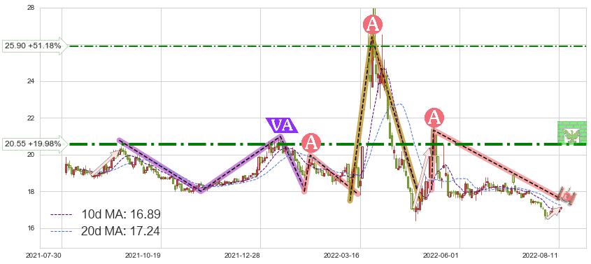 ♘ 阻力价格位25.90,可信任强度52.04%,距离最后交易2022-08-12形成的收盘价格17.13相差 +51.18%