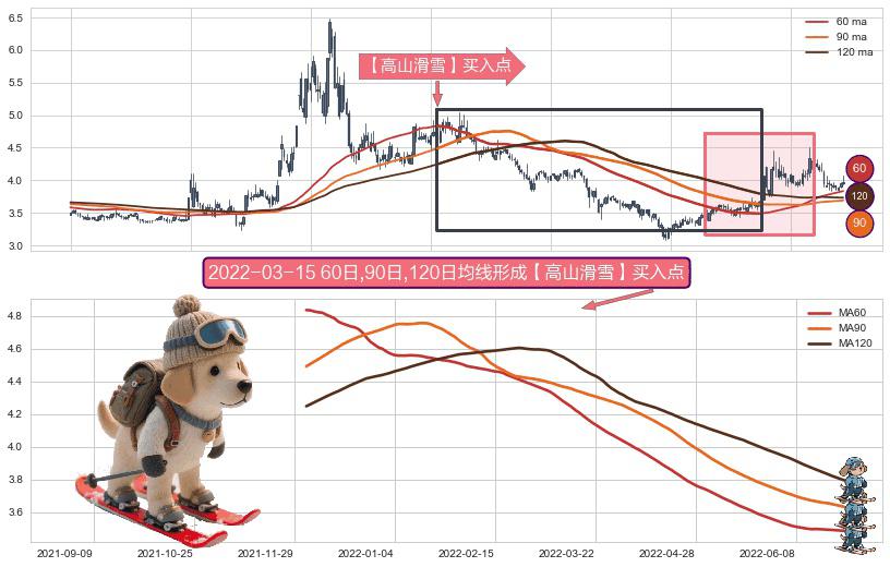 形态多维评估: ⚀ 2021-12-02日-2022-06-24日显现 60日-90日-120日均线 【高山滑雪】买入点 看多信号,后市看涨,买入