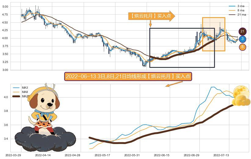 形态多维评估: ⚀ 2022-05-06日-2022-07-18日显现 3日-8日-21日均线 【烘云托月】买入点 看多信号,后市看涨,买入