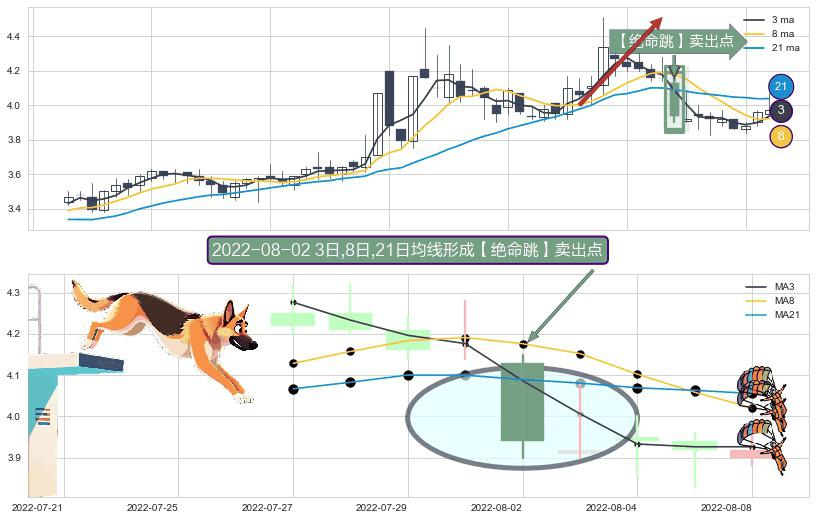 形态多维评估: ⚀ 2022-08-02日显现 3日-8日-21日均线 【绝命跳】卖出点 看空信号,后市看跌,卖出