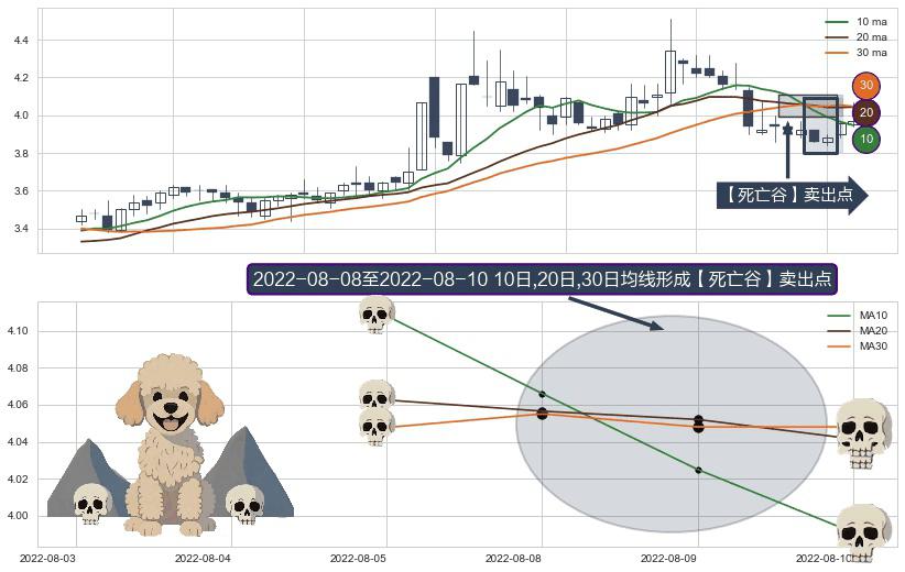 形态多维评估: ⚀ 2022-08-09-日至2022-08-10-日显现 10日-20日-30日均线 【死亡谷】卖出点 看空信号,后市看跌,卖出
