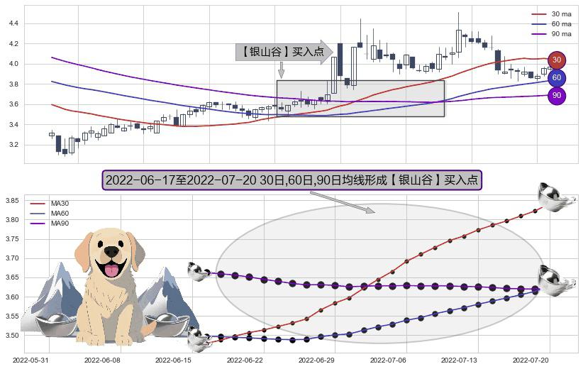 形态多维评估: ⚀ 2022-06-20-日至2022-07-20-日显现 30日-60日-90日均线 【银山谷】买入点 看多信号,后市看涨,买入