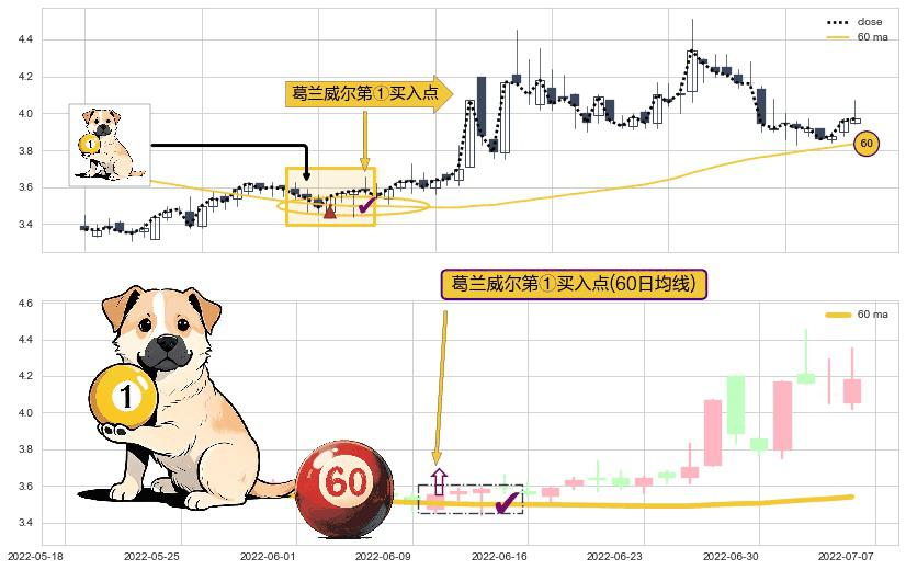 形态多维评估: ⚀ 2022-06-10-日显现 葛兰威尔均线 60日均线 第买①入点 走势反转见底信号,后市看涨,买进信号