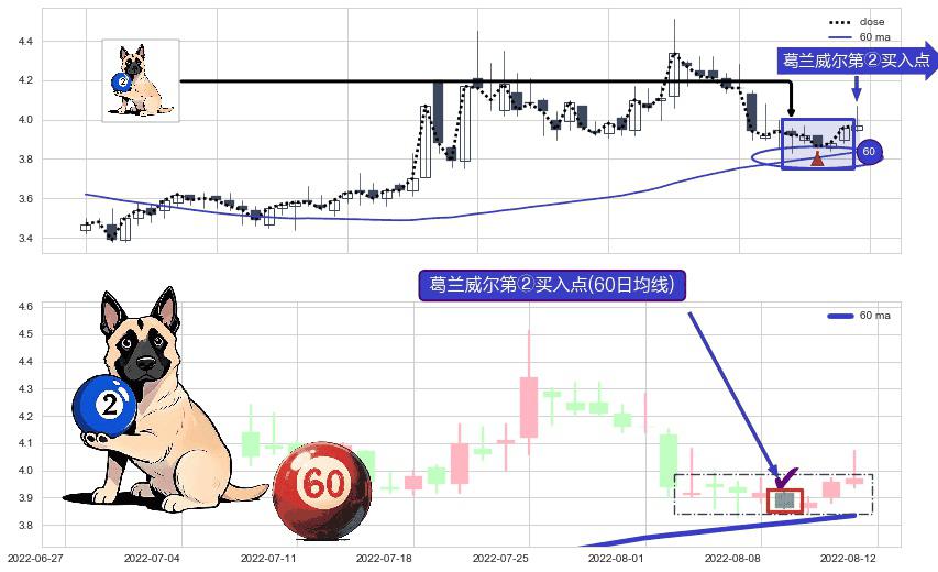 形态多维评估: ⚀ 2022-08-09-日显现 葛兰威尔均线 60日均线 第②买入点 上升趋势的中继信号,后市看涨,买进信号