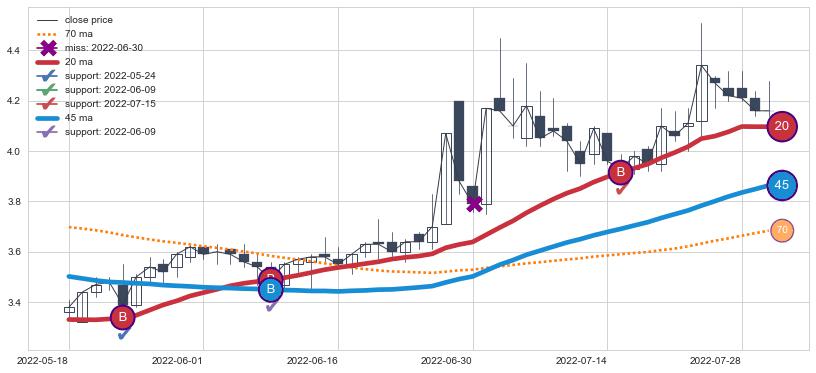 上涨趋势2022-05-18-2022-08-01,均线20, 45确认关键支撑3处