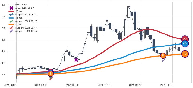 上涨趋势2021-08-02-2021-10-25,均线20, 45, 70确认关键支撑2处