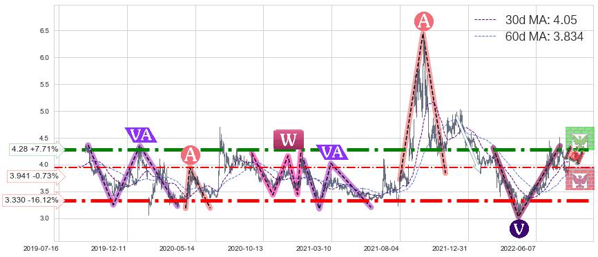 ♘ 支撑价格位3.330,可信任强度99.20%,距离最后交易2022-08-12形成的收盘价格3.970相差 -16.12%