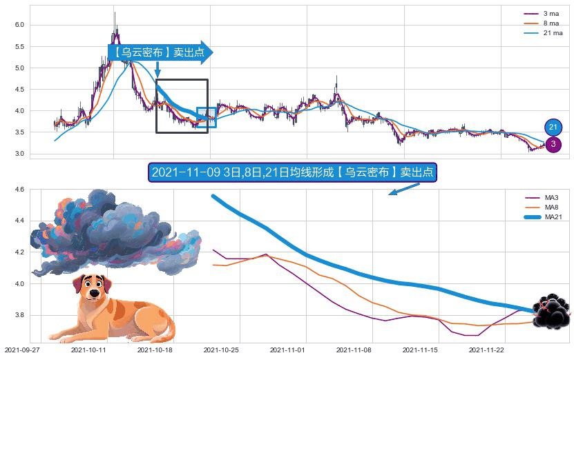 ⚀ 2021-10-21日-2021-11-25日显现 3日-8日-21日均线 【乌云密布】卖出点 看空信号,后市看跌,卖出