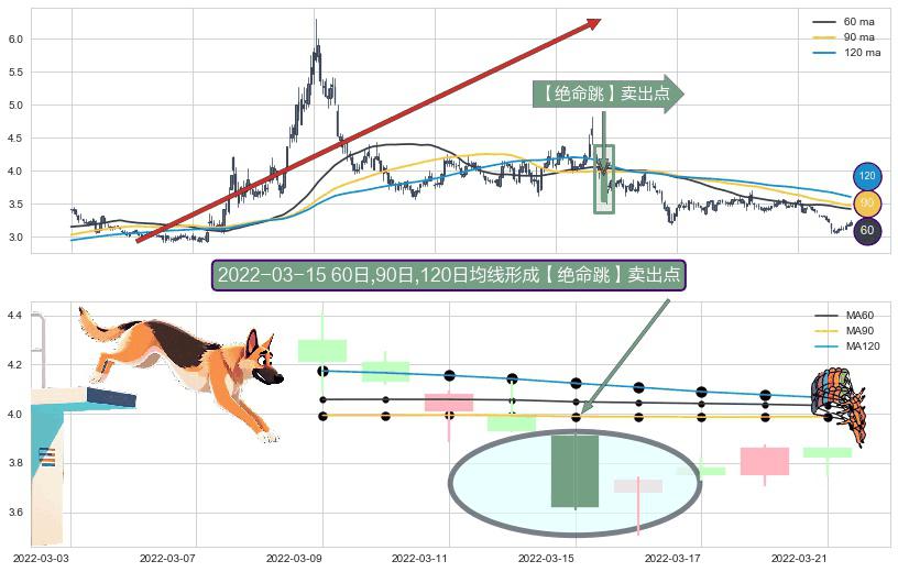 ⚀ 2022-03-15日显现 60日-90日-120日均线 【绝命跳】卖出点 看空信号,后市看跌,卖出