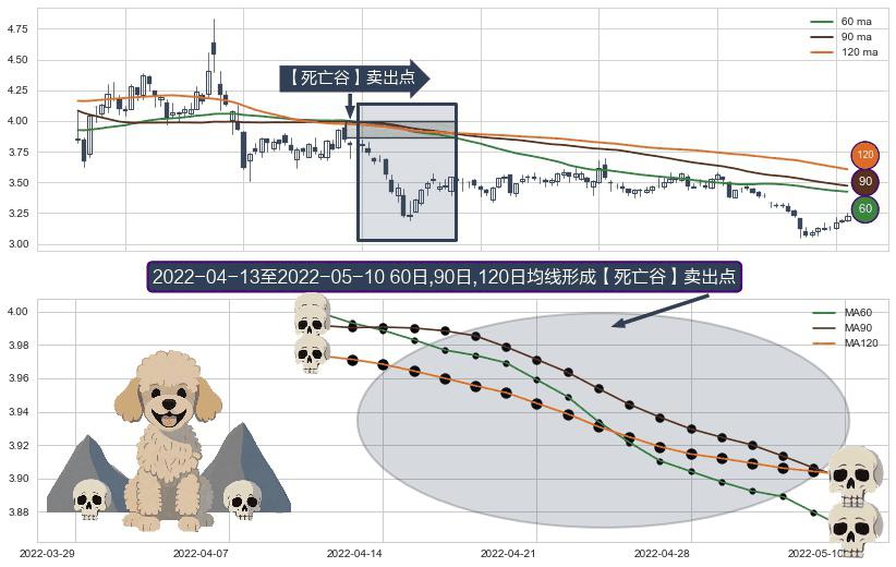 ⚀ 2022-04-14-日至2022-05-10-日显现 60日-90日-120日均线 【死亡谷】卖出点 看空信号,后市看跌,卖出