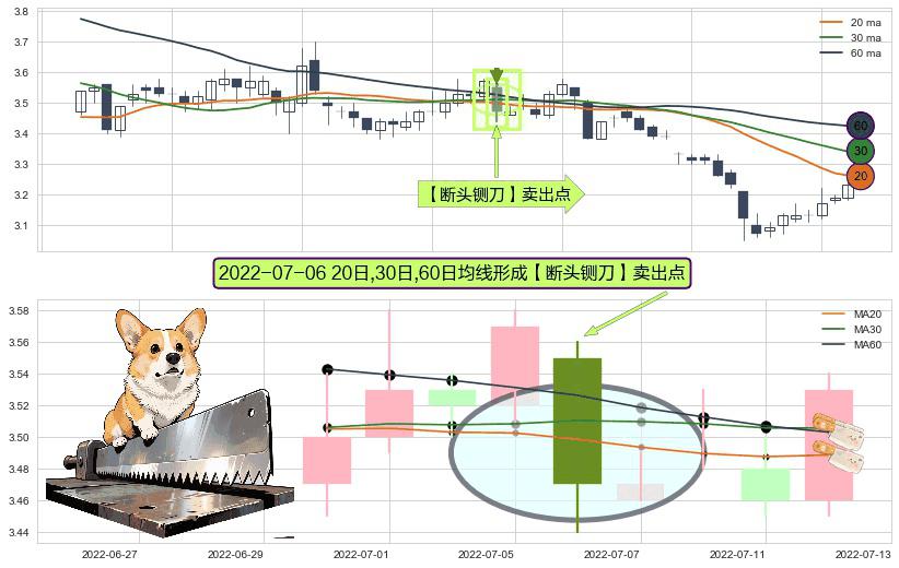 ⚀ 2022-07-06日显现 20日-30日-60日均线 【断头铡刀】卖出点 看空信号,后市看跌,卖出