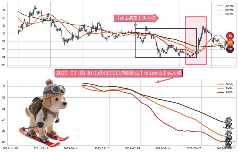 ⚀ 2022-01-13日-2022-06-09日显现 30日-60日-90日均线 【高山滑雪】买入点 看多信号,后市看涨,买入
