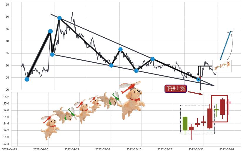 | 12 🅚:看涨(低位)倒锤头线 ➕ 📐:降楔型向上突破击穿阻力位, 猜想持续拉升上涨,被突破的阻力位已变为支撑位 ☞ 看多信号 ⇥ 【🅚线】交织【图形】⇥ 综合量化分数: 51 | > |