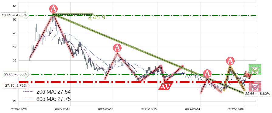 ♘ 阻力价格位29.83,可信任强度78.07%,距离最后交易2022-08-12形成的收盘价格27.91相差 +6.88%