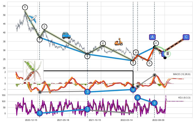 ➣ 第一, 三, 五浪下跌动能逐渐【衰弱变小】,趋势呈现不稳迹象