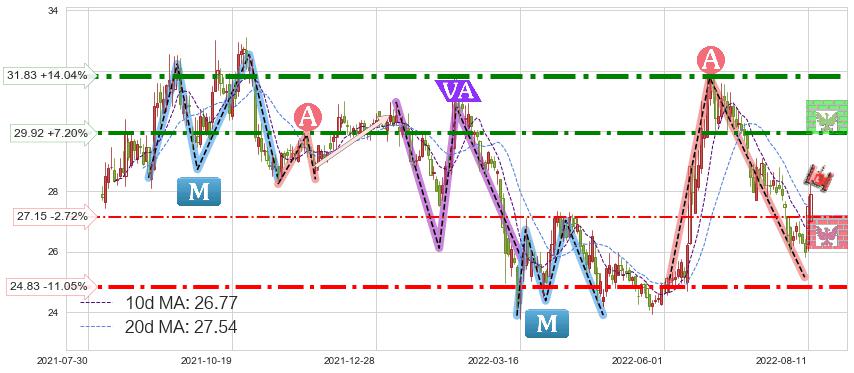♘ 支撑价格位27.15,可信任强度46.80%,距离最后交易2022-08-12形成的收盘价格27.91相差 -2.72%