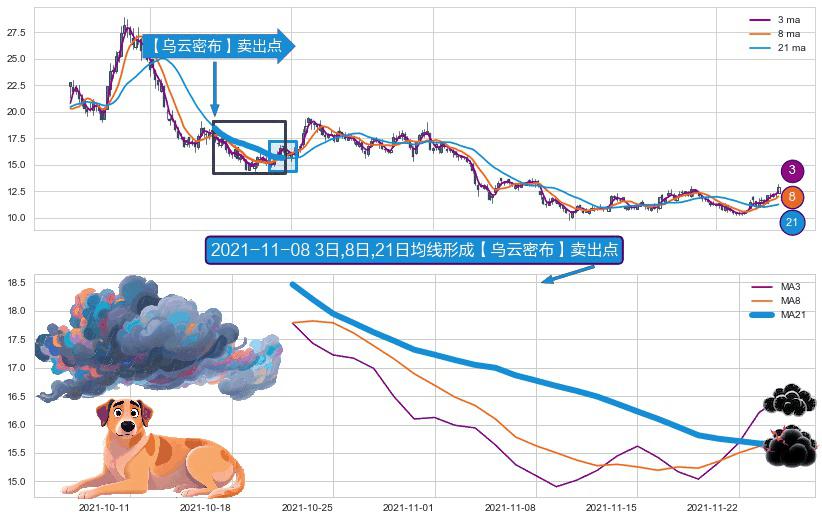 ⚀ 2021-10-21日-2021-11-24日显现 3日-8日-21日均线 【乌云密布】卖出点 看空信号,后市看跌,卖出