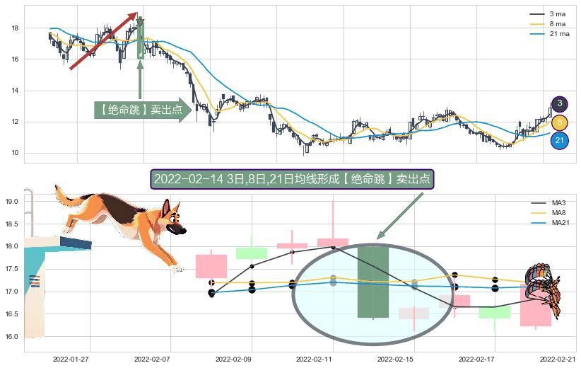 ⚀ 2022-02-14日显现 3日-8日-21日均线 【绝命跳】卖出点 看空信号,后市看跌,卖出