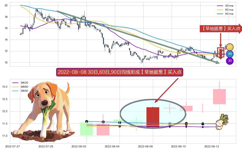 ⚀ 2022-08-08日显现 30日-60日-90日均线 【旱地拔葱】买入点 看多信号,后市看涨,买入