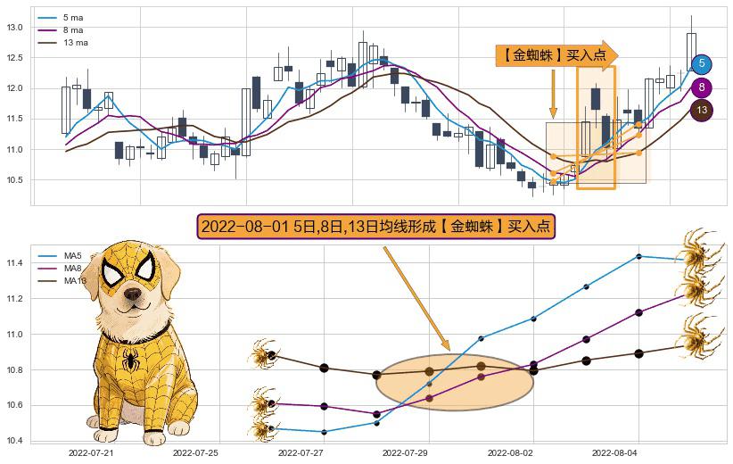 ⚀ 2022-08-01日显现 5日-8日-13日均线 【金蜘蛛】买入点 看多信号,后市看涨,买入