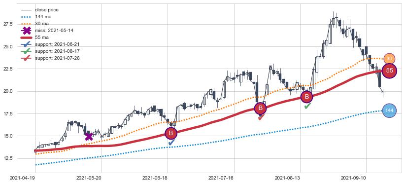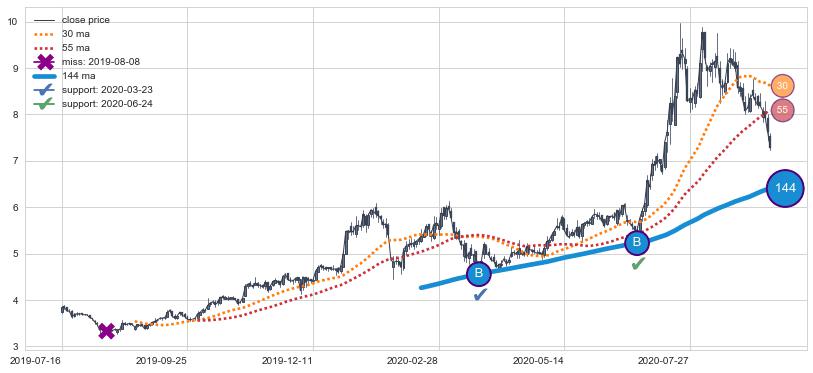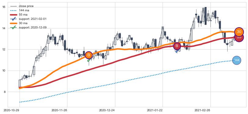 ⚁ MA3和MA8走势平行,且始终保持在短距离内,MA21始终在短中期均线上方,与短中期均线保持一定的距离,微微下行