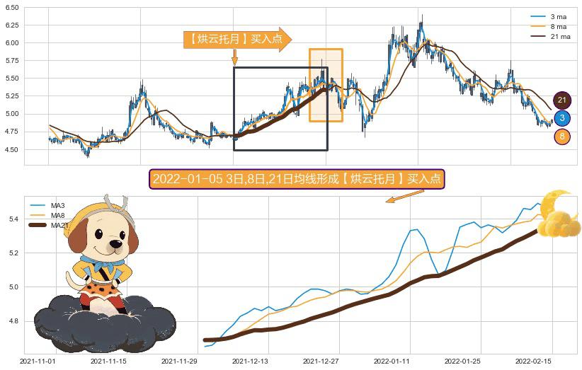 形态多维评估: ⚀ 2021-11-30日-2022-02-15日显现 3日-8日-21日均线 【烘云托月】买入点 看多信号,后市看涨,买入