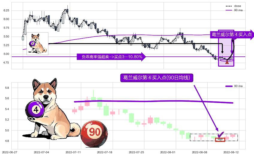 形态多维评估: ⚀ 2022-08-10-日显现 葛兰威尔均线 90日均线 第④买入点 下降趋势均值回复的短线反弹信号,后市看涨,买进信号