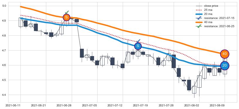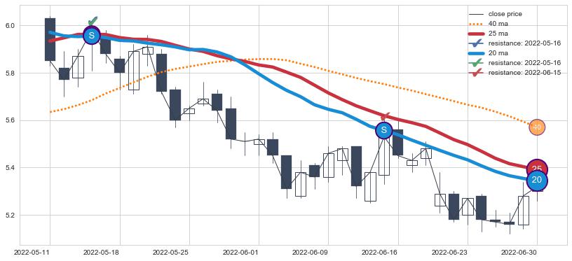 下跌趋势2022-05-11-2022-06-30,均线25, 20确认关键阻力2处