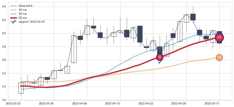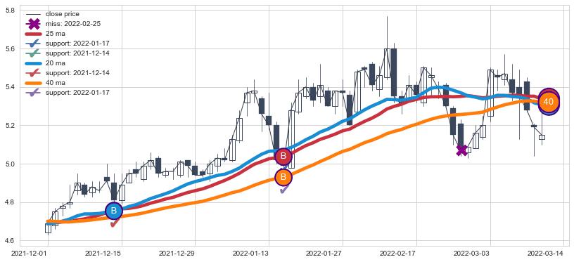 上涨趋势2021-12-01-2022-03-14,均线40, 25, 20确认关键支撑2处