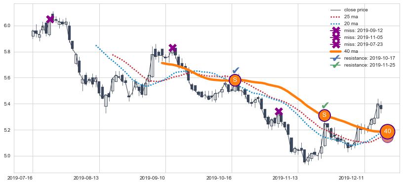 下跌趋势2019-07-16-2019-12-18,均线40确认关键阻力2处