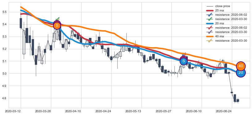 下跌趋势2020-03-12-2020-06-30,均线40, 25, 20确认关键阻力2处
