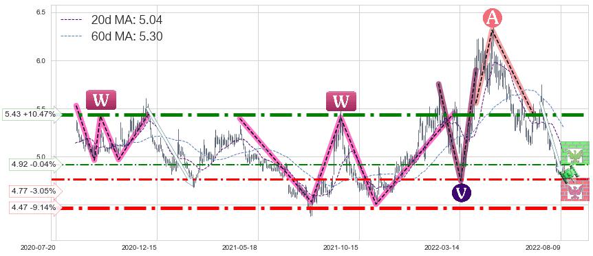 ♘ 支撑价格位4.77,可信任强度61.35%,距离最后交易2022-08-12形成的收盘价格4.92相差 -3.05%