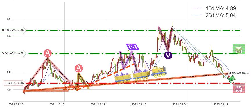 ➣ 【仅预测突破】最后价格:4.92与预测突破价格:5.23→【空间中等】后续最小【整理】第一目标价格→(2022-10-11: 6.74 )