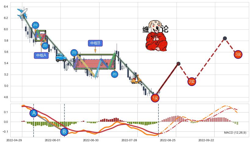 ➣ 【中枢B】:2022-06-13-2022-07-12,中枢由6笔构成,共22交易日, ZG=5.47, ZD=5.32