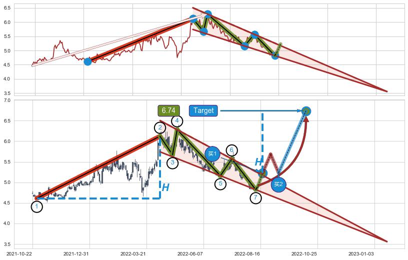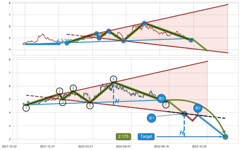 ➣ 【未确认突破,预测即将形成突破】降🚩楔型起点:2021-10-28, 预测突破点:2022-08-18,形态共199交易日