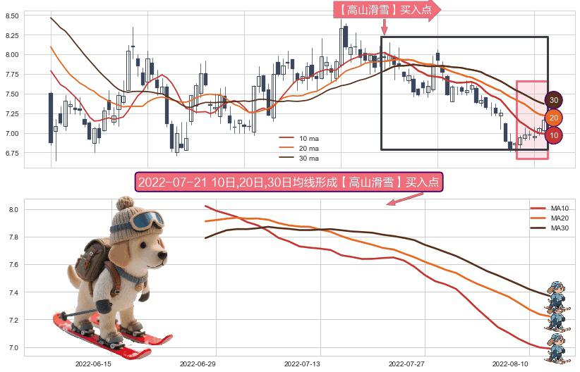 ⚀ 2022-06-28日-2022-08-12日显现 10日-20日-30日均线 【高山滑雪】买入点 看多信号,后市看涨,买入