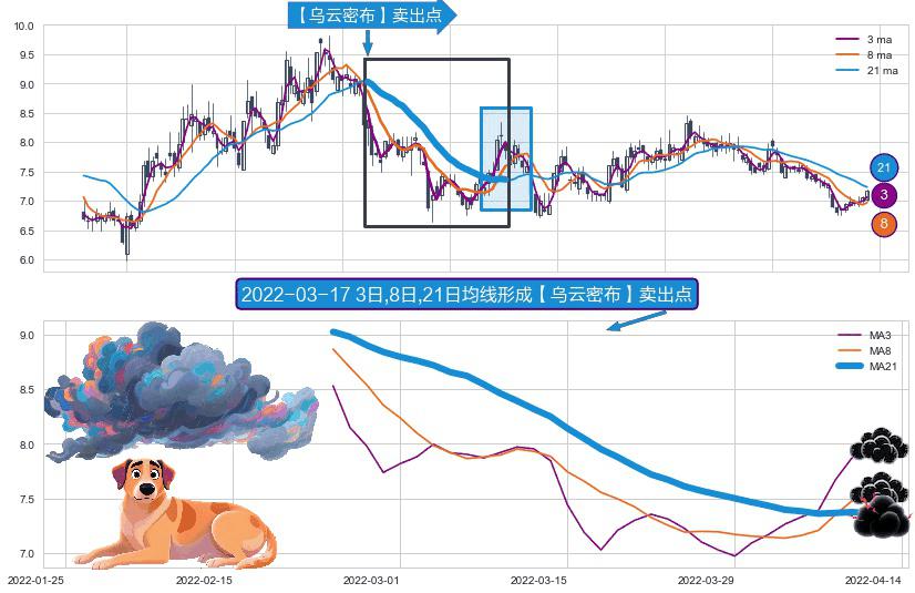 ⚀ 2022-02-23日-2022-04-12日显现 3日-8日-21日均线 【乌云密布】卖出点 看空信号,后市看跌,卖出