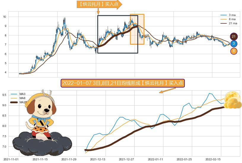 ⚀ 2021-12-02日-2022-02-18日显现 3日-8日-21日均线 【烘云托月】买入点 看多信号,后市看涨,买入