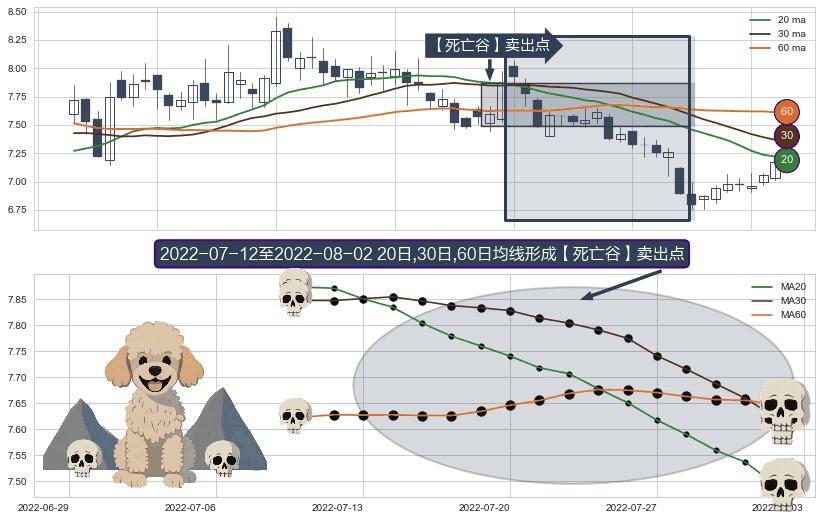 ⚀ 2022-07-13-日至2022-08-02-日显现 20日-30日-60日均线 【死亡谷】卖出点 看空信号,后市看跌,卖出