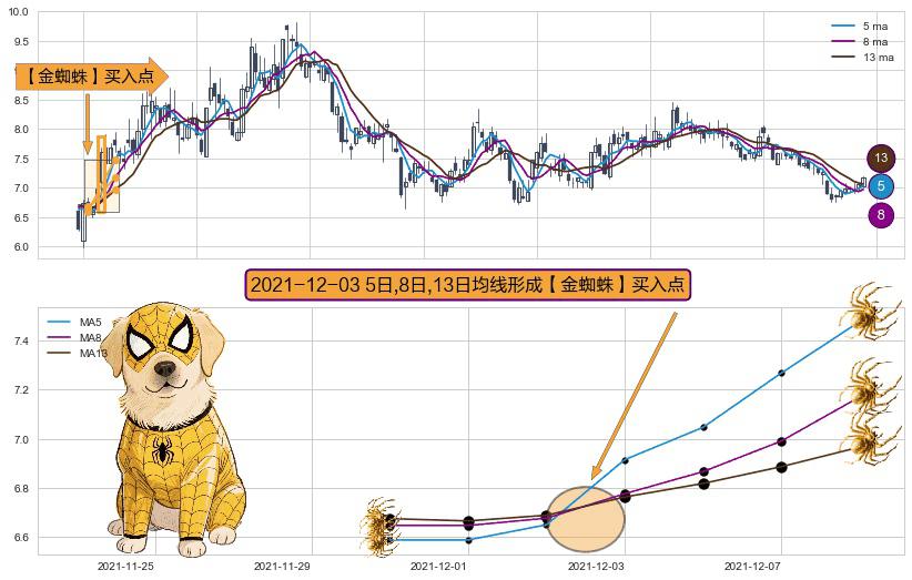 ⚀ 2021-12-03日显现 5日-8日-13日均线 【金蜘蛛】买入点 看多信号,后市看涨,买入