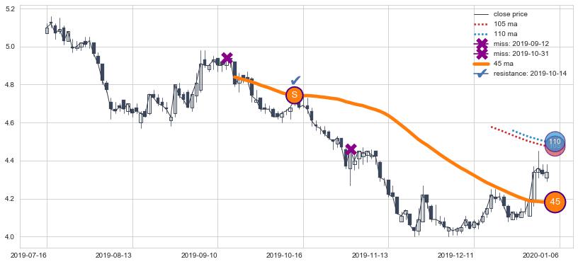 ➢ 最优均线组合共正确确认支撑阻力信号2处,正确确认率 40.00%