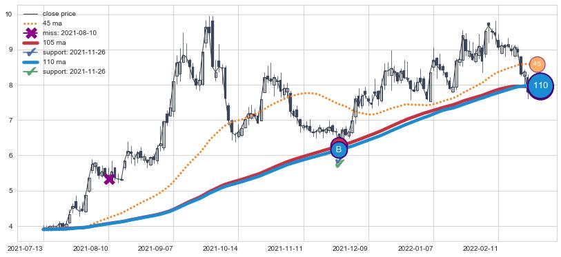 ⚁ MA3和MA8走势平行,且始终保持在短距离内,MA21始终在短中期均线下方,与短中期均线保持一定的距离,微微上行
