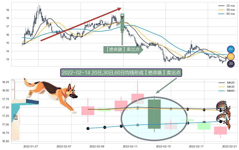 形态多维评估: ⚀ 2022-02-14日显现 20日-30日-60日均线 【绝命跳】卖出点 看空信号,后市看跌,卖出
