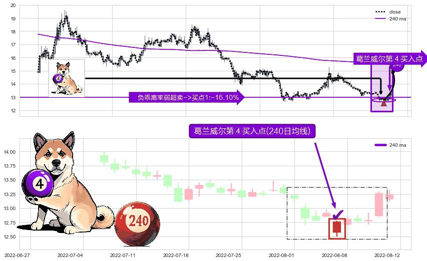 形态多维评估: ⚀ 2022-08-05-日显现 葛兰威尔均线 240日均线 第④买入点 下降趋势均值回复的短线反弹信号,后市看涨,买进信号