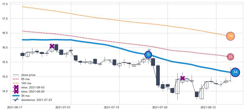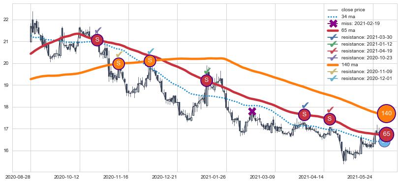 下跌趋势2020-08-28-2021-05-27,均线65, 140确认关键阻力6处