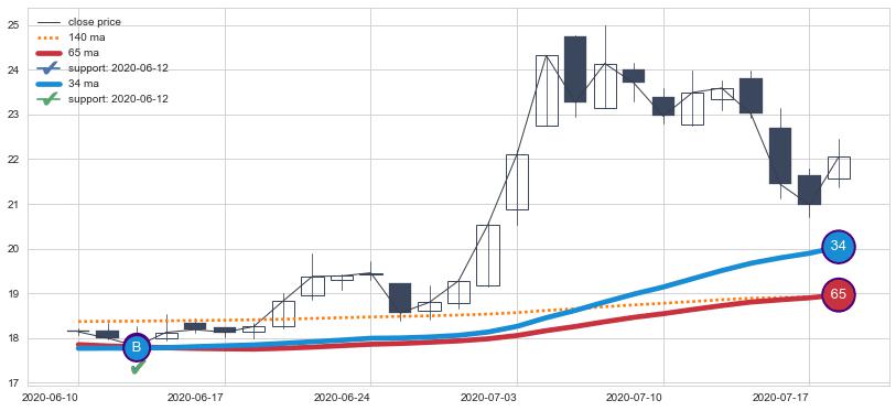 上涨趋势2020-06-10-2020-07-20,均线65, 34确认关键支撑1处