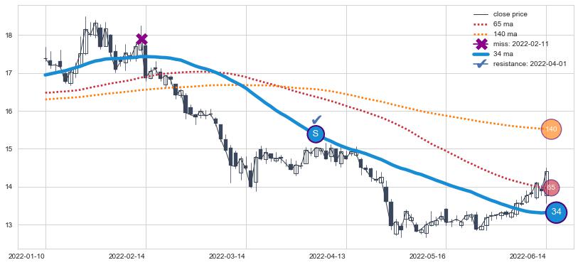下跌趋势2022-01-10-2022-06-14,均线34确认关键阻力1处