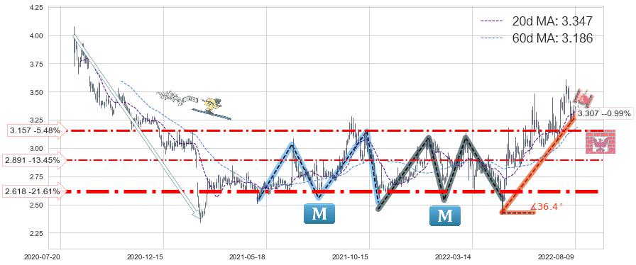 ♘ 支撑价格位3.157,可信任强度57.44%,距离最后交易2022-08-12形成的收盘价格3.340相差 -5.48%